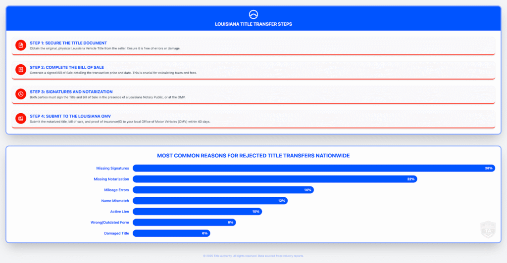 Vehicle title transfers in Louisiana confuse many buyers and sellers. You deal with rules, signatures, taxes, and paperwork that must be correct the first time. This guide provides clear steps to help you avoid delays and complete your transfer without the need for repeat visits.